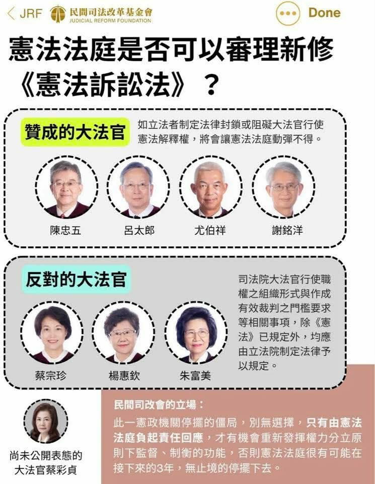 因此,就她看來,憲法法庭不是「不能」,而是「不為」,人民對此一定要發出聲音質疑大法官,「你們怎麼可以讓一個法律把你憲法法庭癱瘓掉?」,如此嚴厲的批判終於使得不滿挨轟「大法官怠惰、在睡覺」的蔡宗珍、楊惠欽、朱富美三位聯合發出聲明,以避免媒體「嚴重誤導社會視聽」。